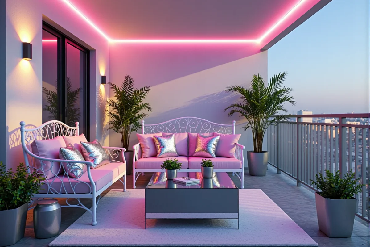 Wieczorna aranżacja luksusowego balkonu z girlandami LED i różowymi akcentami dekoracyjnymi.