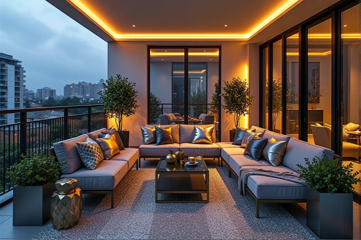Jak urządzić balkon w stylu glamour z oświetleniem LED w kolorze złota i srebra?